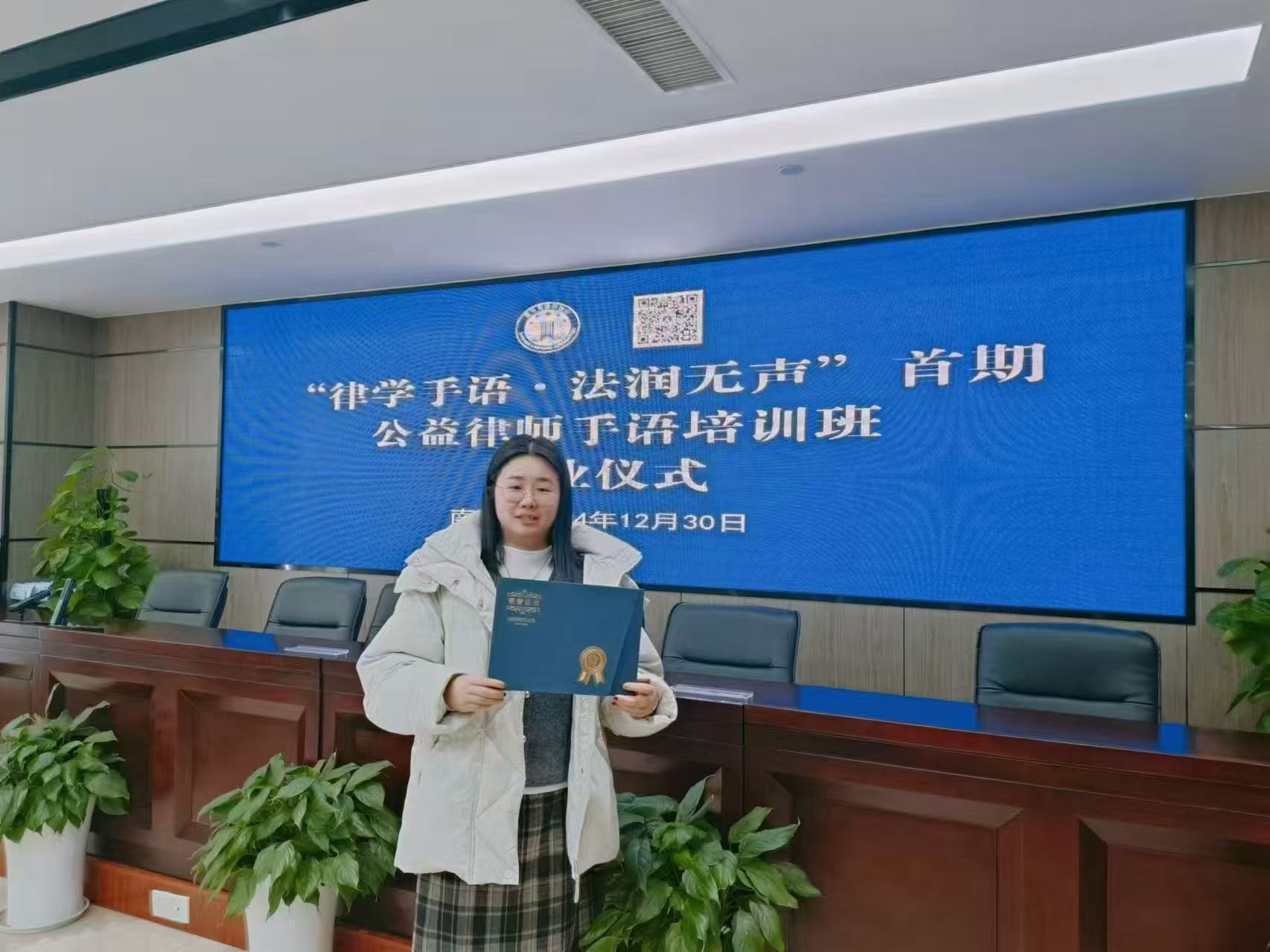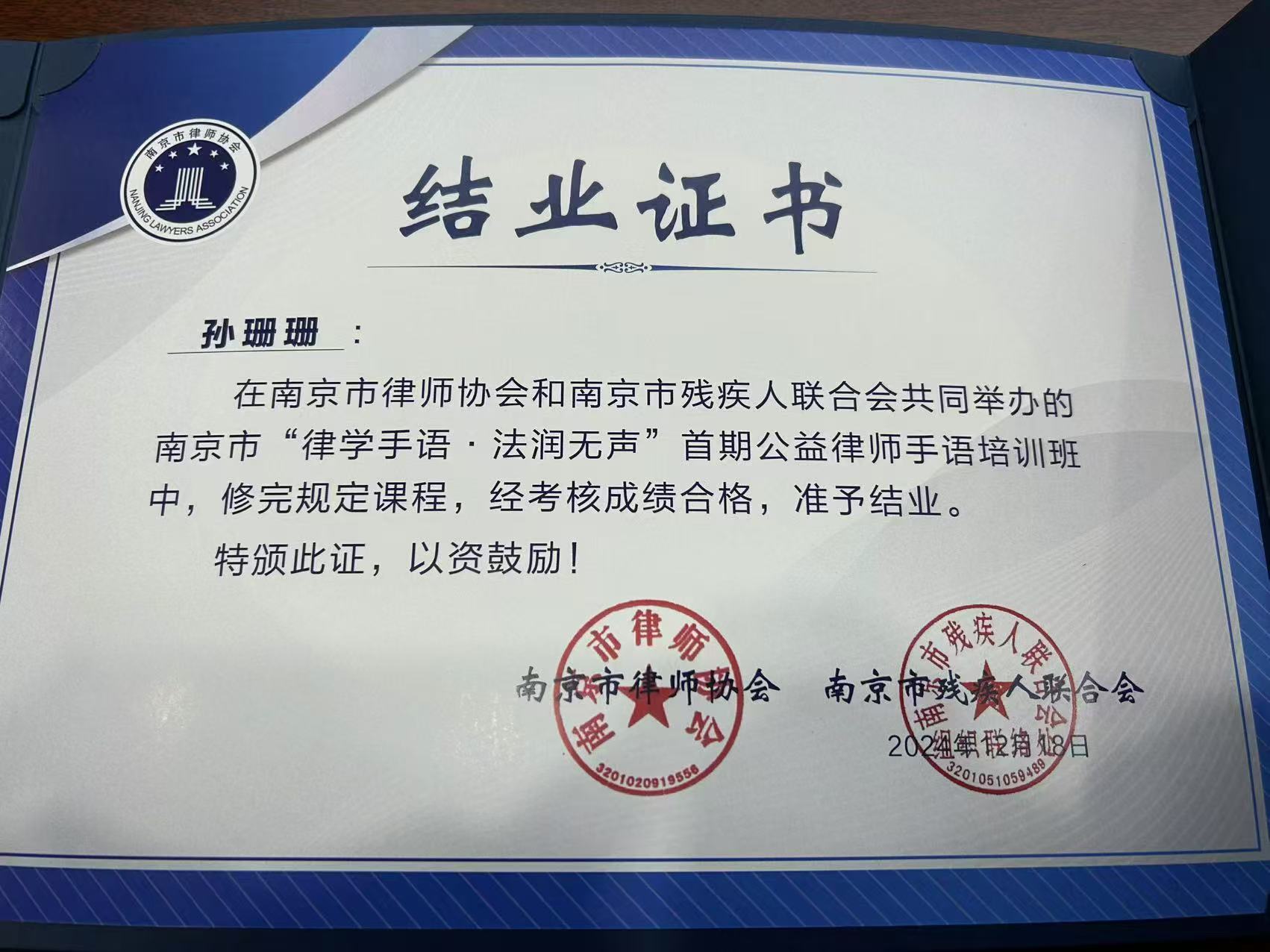 北京友恒(南京)律师事务所孙珊珊律师作为学员参加了本次学习,并于近日通过手语考试,顺利结业。孙珊珊律师在培训期间表现突出,不仅掌握了扎实的手语沟通技巧,还积极参与实践活动,展现了良好的专业素养和服务精神。